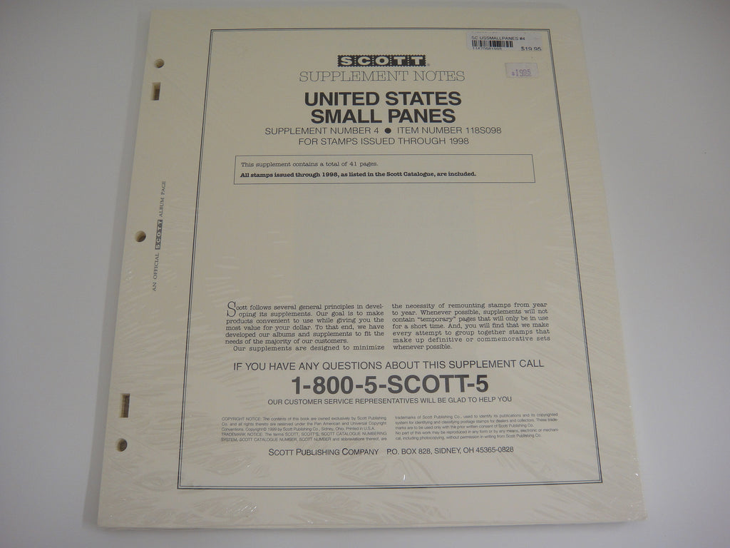 Brand: Scott Series: National Country: United States Year: 1998 Pages: 41 Product#: 118S098 Supplement#: 4 Stock#: 3675 Notes: For stamps issued through 1998; for 2-post or 3-ring binders