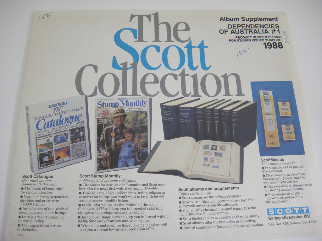Brand: Scott Series: Specialty Country: Dependencies of Australia Year: 1988 Pages: Product#: 211S088 Supplement#: 1 Stock#: 3515 Notes: For stamps issued through 1988