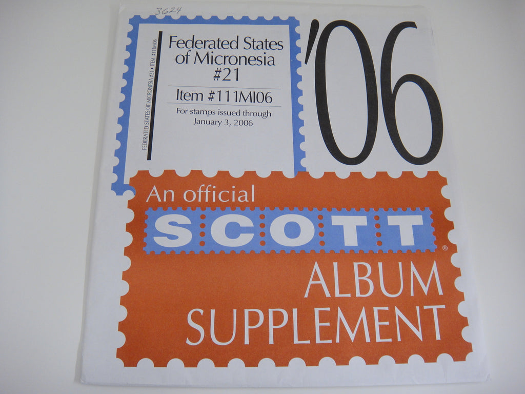 Brand: Scott Series: Specialty Country: Federated States of Micronesia Year: 2006 Pages: 11 Product#: 111MI06 Supplement#: 21 Stock#: 3624 Notes: For stamps issued through January 3, 2006; for 3-ring or 2-post binders