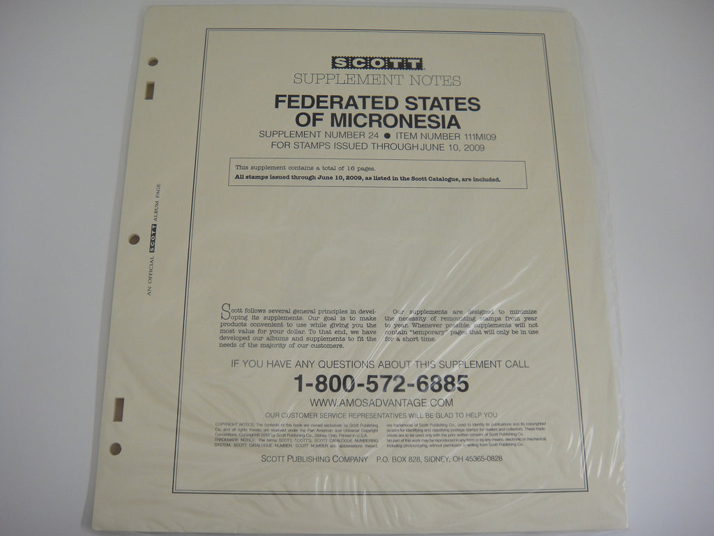 Brand: Scott Series: Specialty Country: Federated States of Micronesia Year: 2009 Pages: 16 Product#: 111MI09 Supplement#: 24 Stock#: 3621 Notes: For stamps issued through June 10, 2009; for 2-post and 3-ring binders