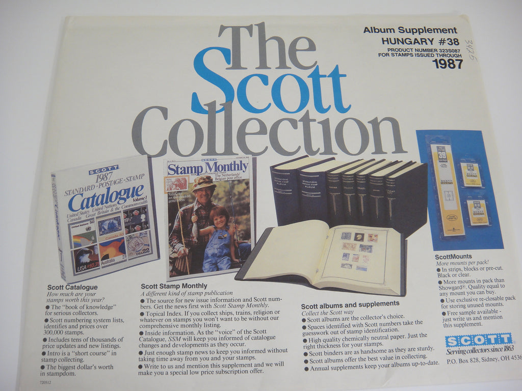 Brand: Scott Series: Specialty Country: Hungary Year: 1987 Pages: 7 Product#: 323S087 Supplement#: 38 Stock#: 3425 Notes: For stamps issued through 1987, new old stock